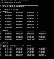 만약 옵션을 설정하지 않으면 x/1xw 의 옵션으로 기본 설정되어 있습니다. 그리고 gdb는 그냥 엔터를 입력할 경우 전에 사용했던 명령어로 다시 실행되어 출력됩니다.