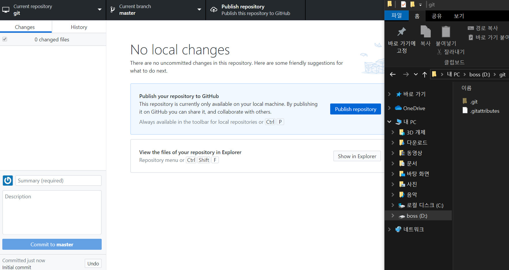 Create repo를 클릭하면 온라인저장소와 연동되는 로컬저장소가 만들어집니다.