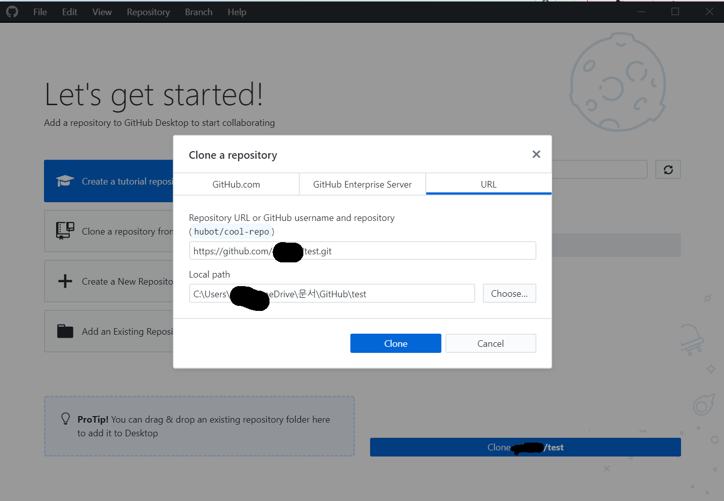 이미 사용중인 Repo가 있을 경우 GithubDesktop 첫화면에서 clone할 수 있습니다.