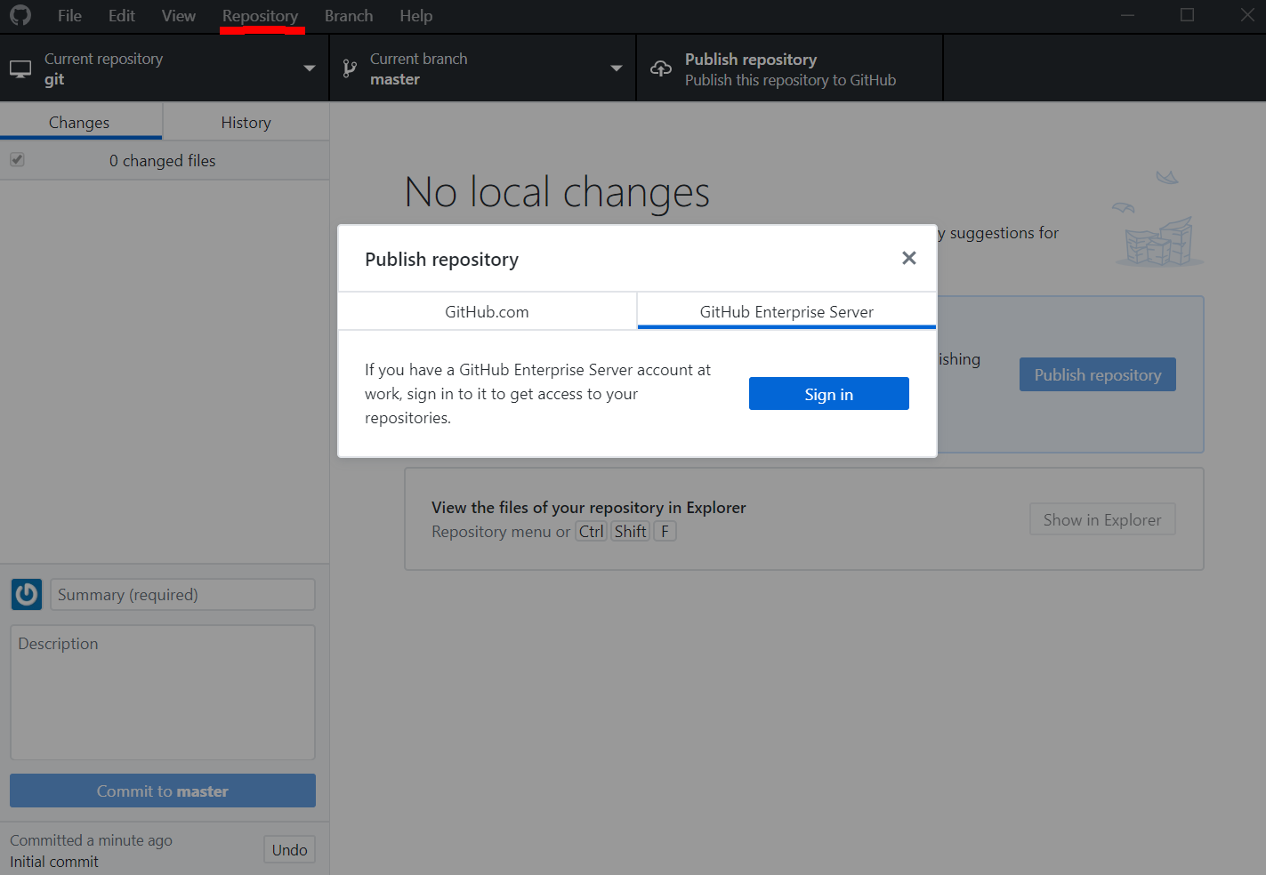 위의 화면에서 Enterprise Server는 입력하는 곳이므로 Sign in 없어도 됩니다. 바로 Github.com에서 있는 기본값 옵션으로 생성하면 온라인 저장소에도 로컬저장소와 연동되는 Repo가 생성됩니다.
