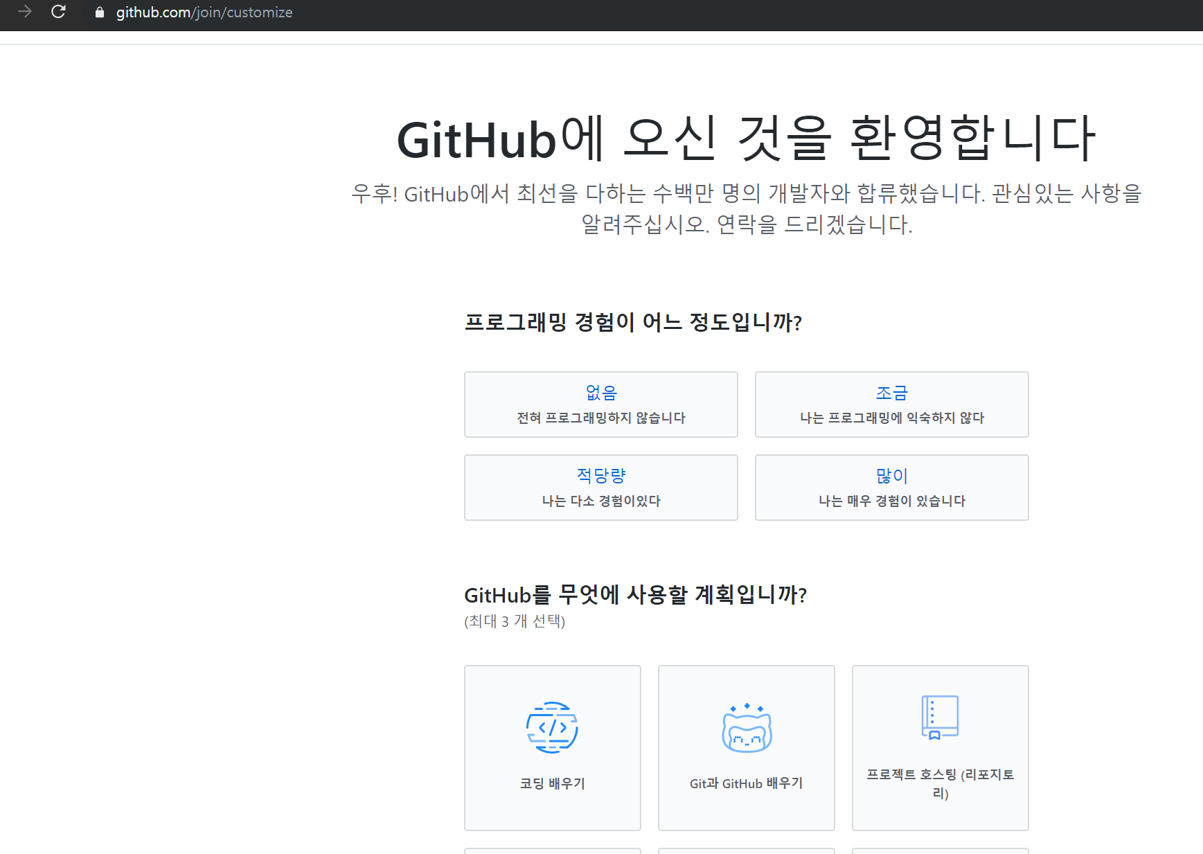 free버전으로 선택 후 다음으로 넘어가면 위의 내용은 간단한 설문 내용임으로 아래에 Complete setup을 클릭하면 설정도 모두 완료됩니다. 이제 해당 이메일에 github확인 메일이 가는데 메일에서 확인 버튼을 눌러줍니다.