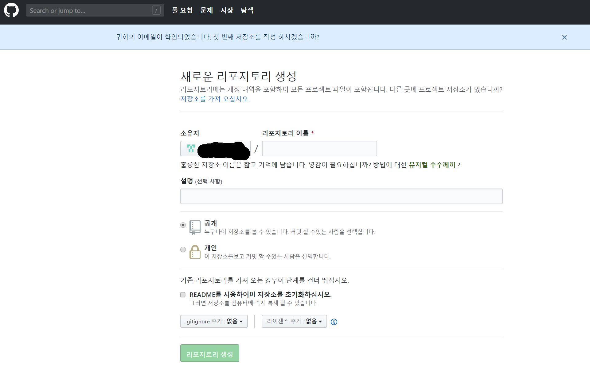 저는 test이름에 공개(public) 설정으로 만들도록 하겠습니다.