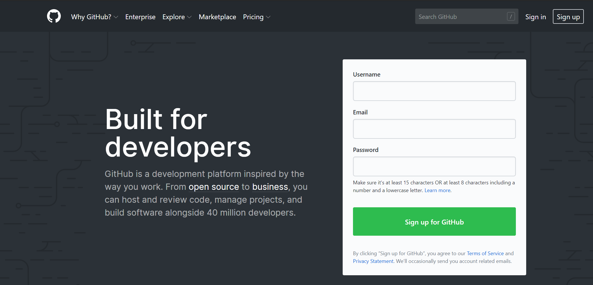 Sing up for Github를 클릭하면 계정생성 화면으로 이동합니다. 사용자이름, 이메일, 패스워드를 입력란에 기입하면 간단히 계정생성이 완료됩니다.