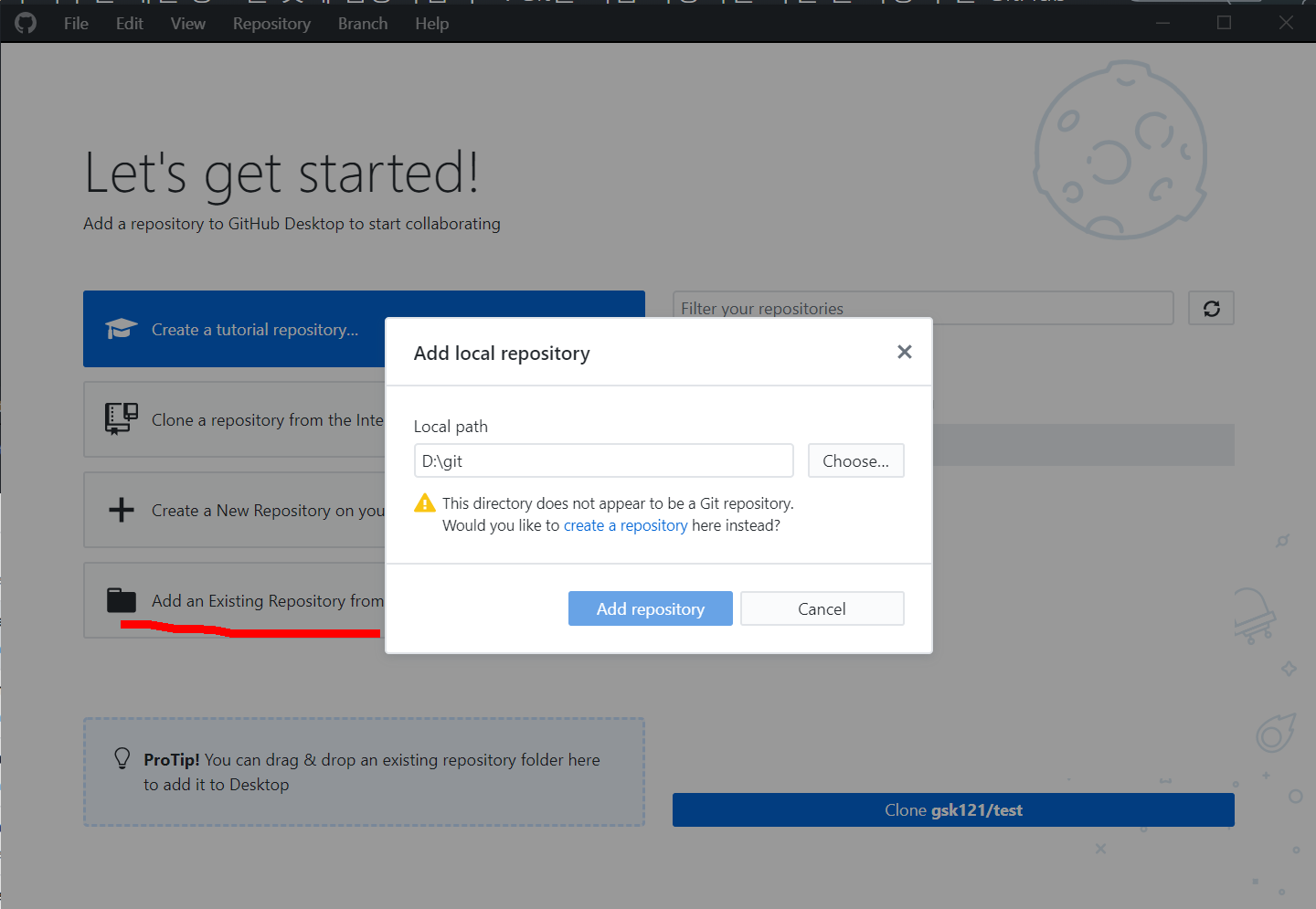 GithubDesktop을 설치하고 해당 계정정보 입력 후 접속하면 위와 같은 화면이 나옵니다. 여기에 Add an Existing Repo...를클릭하여 로컬 저장소를 만들 수 있습니다.