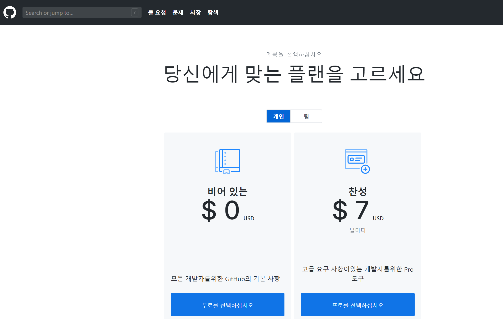 계정생성을 하면 free, pro 선택이 있습니다 . 당연히 무료인 free를 선택하도록 하겠습니다.