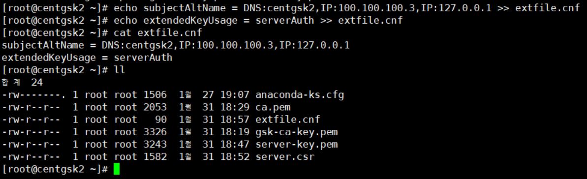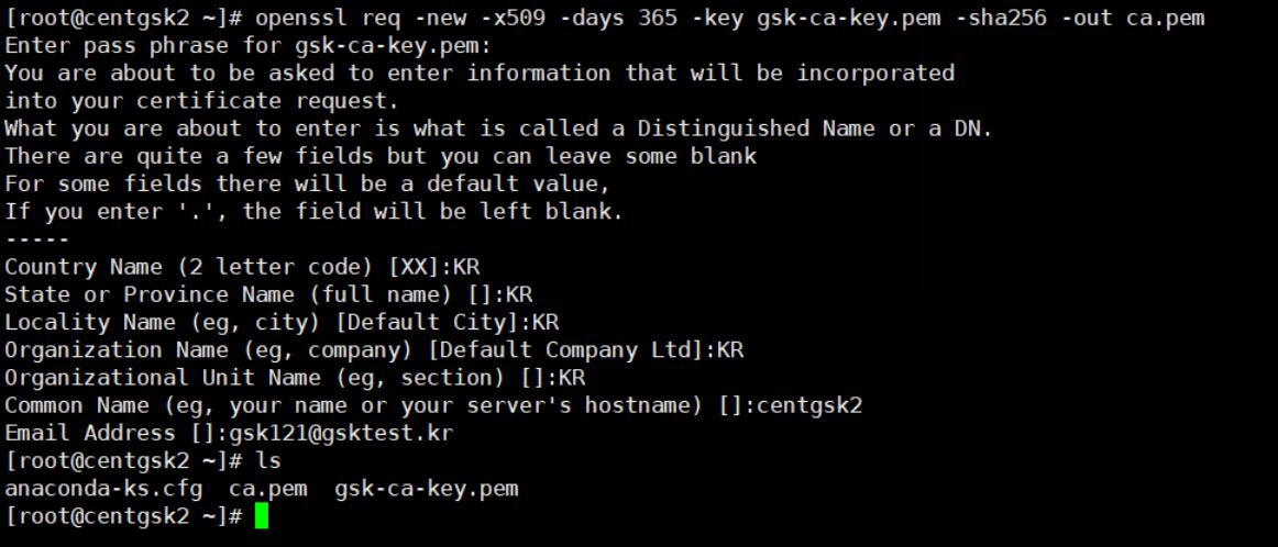 DNS이름이 있을 경우 -subj 에 본인의 DNS 이름을 넣도록 합니다. 저는 테스트서버의 호스트이름인 centgsk2로 통일 시키도록 하겠습니다.