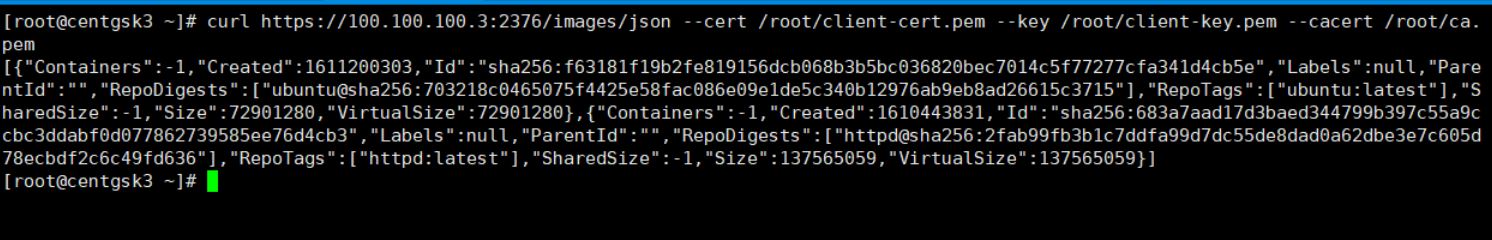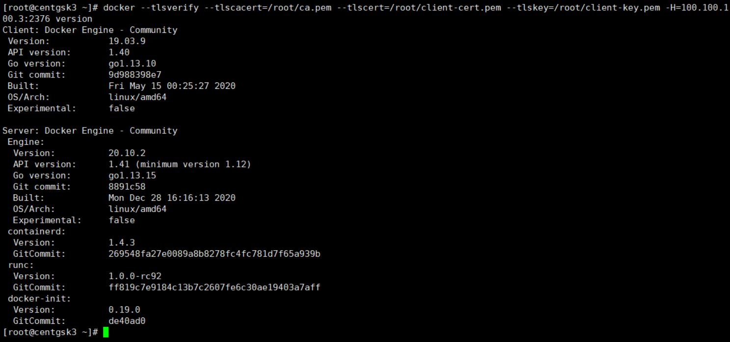 docker --tlsverify --tlscacert=/root/ca.pem --tlscert=/root/client-cert.pem --tlskey=/root/client-key.pem -H=100.100.100.3:2376 version